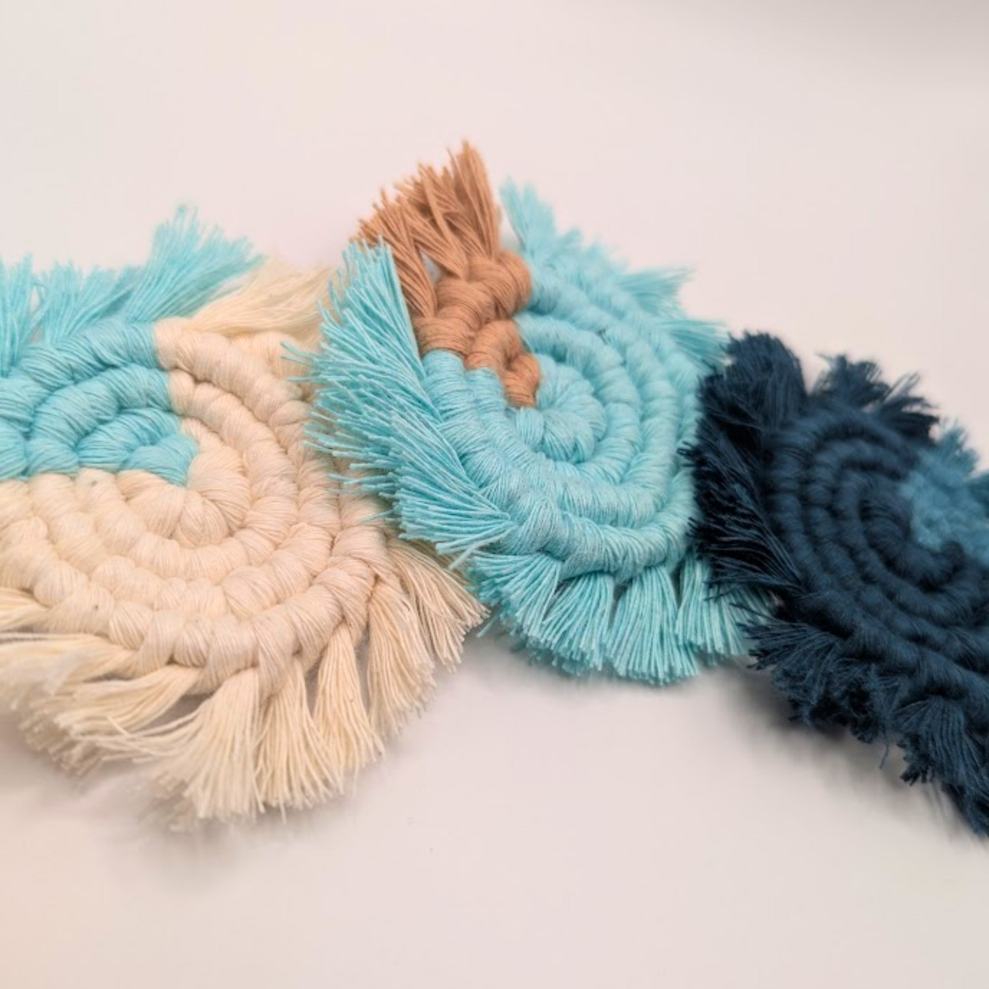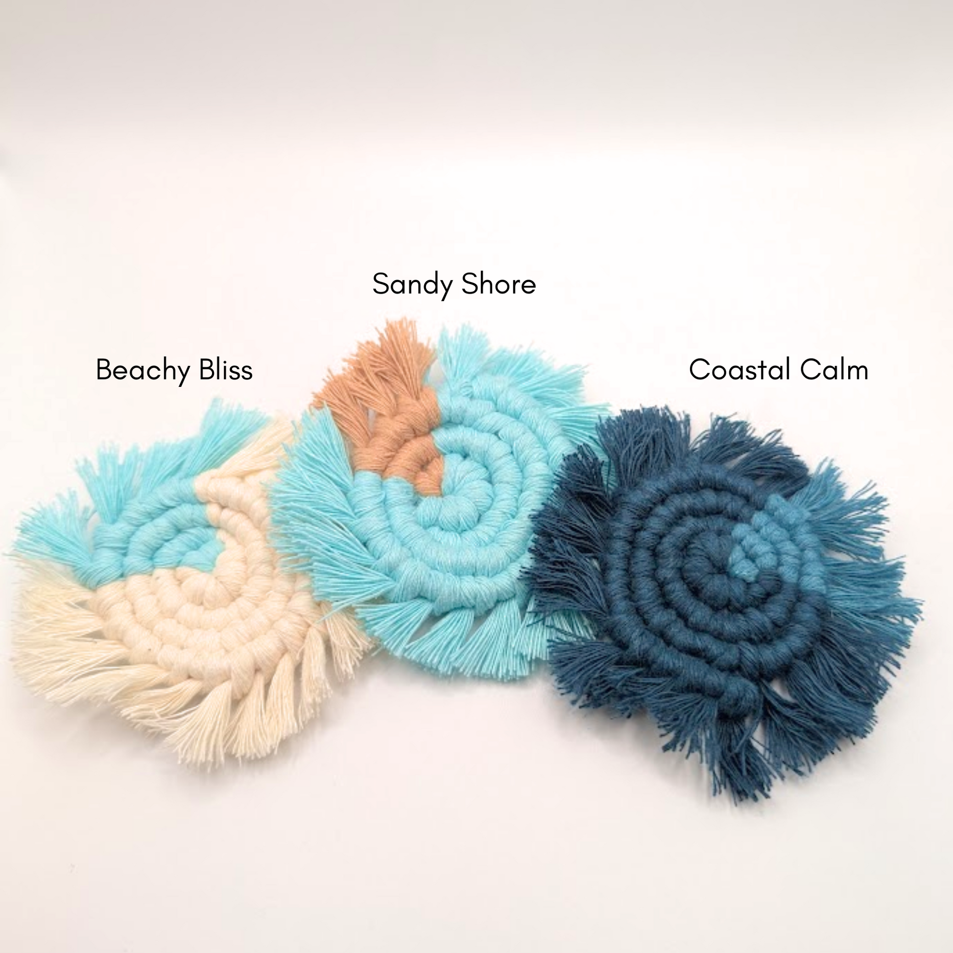 Add boho beach vibes to your ride with these handmade macramé car coasters. Made from soft, absorbent cotton in coastal tones, they keep cup holders clean and stylish. A perfect blend of function and flair!