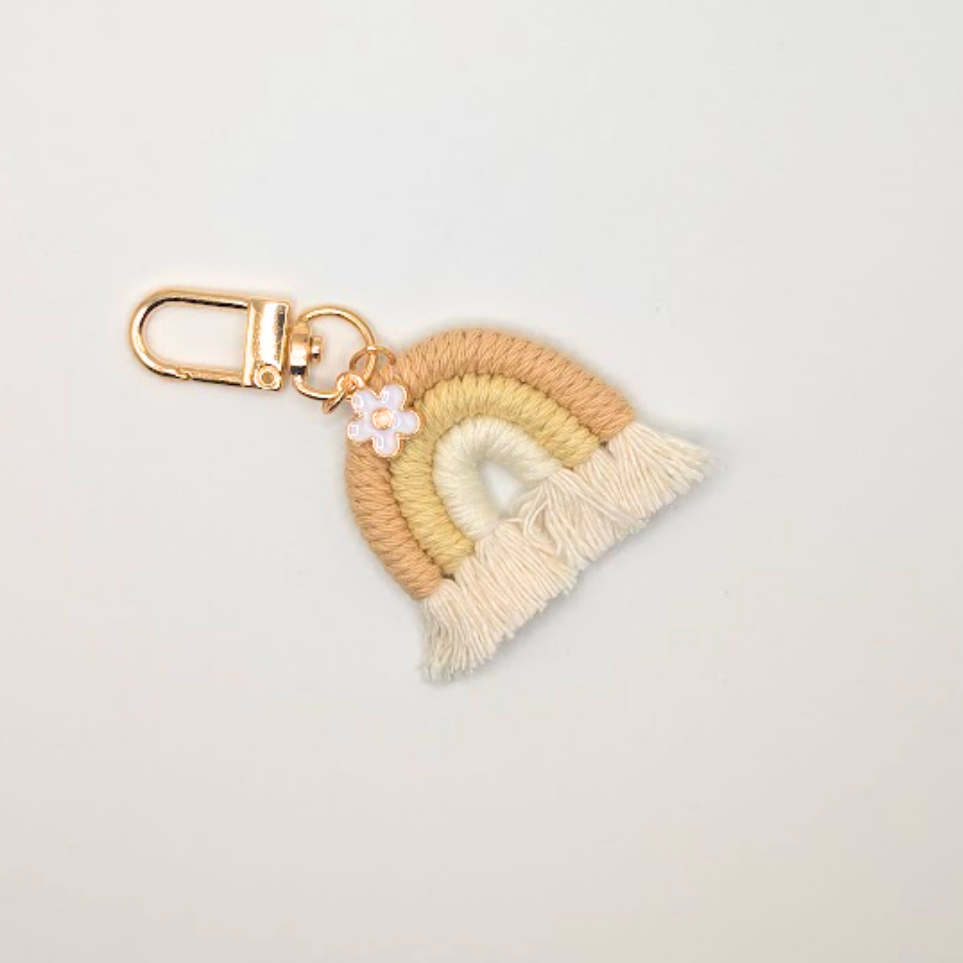Cord woven around itself and then assembled in the design of a rainbow. Neutral tones adorned with a floral charm for just the right dose of sweetness.